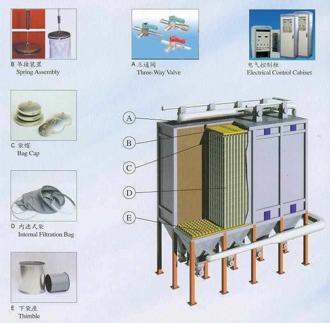 脈沖袋式除塵器其構(gòu)造,它由上、中、下箱體、排灰系統(tǒng)及噴吹系統(tǒng)五部分組成。上箱體包括可掀起的蓋板和出風口;中箱體內(nèi)有多孔板; 濾袋框架、濾袋及文氏管;下箱體由灰斗、進風口及檢查門組成;噴吹系統(tǒng)包括控制儀表、控制閥、脈沖閥、噴吹管和氣包。